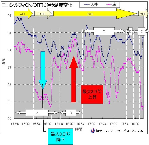エコシルフィONのとき、足元温度が最大24.5℃確保されていた環境でしたが、エコシルフィOFFにしますと足元温度が20.7℃まで3.8℃も急降下しました。そこから再度エコシルフィをONにしますと足元温度が24.6℃まで最大3.9℃上昇することが確認出来ました。