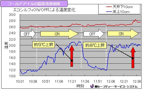 エコシルフィをONにしますと約8〜9℃の床温度上昇が確認されコールドアイル状況の顕著な改善が確認されました。