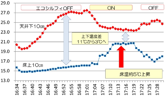 エコシルフィ運転による温度計測 【運転前】床温度15〜16℃に対し天井付近温度は27℃と約10℃以上の上下温度差のある非効率な温熱環境でした。【エコシルフィ運転後】床温度が約6℃上昇して21℃になり、天井付近温度は逆に23℃付近まで低下してその温度差は2℃程度にまで圧縮されてロスの少ない温熱環境空間に改善されました。
