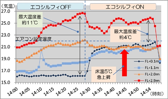 353室 効果測定データ 天井まで伸ばしたポールの4点(床上0.1m・1.1m・2.0m・2.9m)に温度センサーを配置してエアコン22℃暖房運転状態で、エコシルフィ運転のOFF/ONで各ポイントの温度変化を計測いたしました。【エコシルフィ運転前】床温16℃、天井27℃で最大11℃の温度差が発生していました。【エコシルフィ運転後】床温5℃急上昇で平均21℃、逆に天井温度は25℃付近まで下降。上下の温度差は約4℃まで圧縮されました。