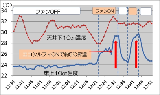 ② カーディーラー様の店舗は高天井・大開口の仕様で外気温度の影響を受けやすく、空調効率が悪く成り易い傾向にあります。特に冬期の暖房運転時には熱偏在が顕著(最大10℃程)で『熱はあるけれど欲しい処に無い!』状態となっているお店が大多数です。結果窓際テーブルの打合せではコールドドラフトの影響も有って足元が冷えて暖まりません。エコシルフィの循環気流が天井部の暖気をお客様の足元に還流させて暖めます。併せ空調設定温度も緩和が可能ですので省エネにも有効です。