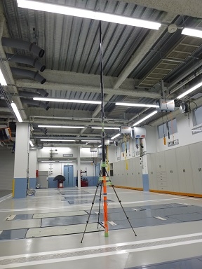 ① CH=4.6mの自動車整備工場の温熱環境改善です。夏暑く冬は寒い工場ですが、労働環境の改善の一環として空調設備がストール毎に配置されました。