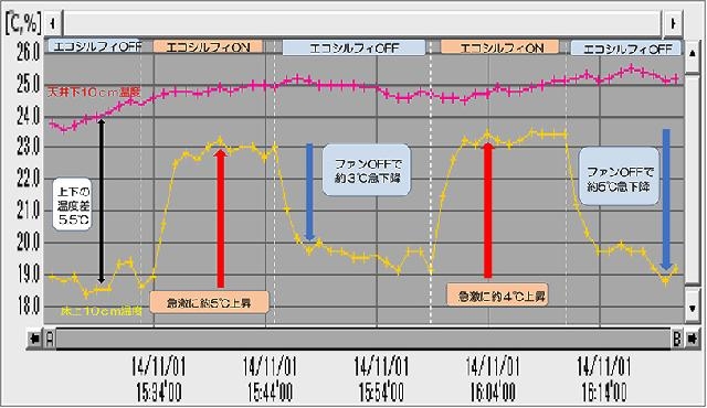 ② 冷房時の冷気は重いために自ずから居住域(作業域)に落ちて改善されますが、冬期の空調暖気は室内空気との質量差から天井方向に上昇して居住域に滞留しないために、なかなか改善効果が得にくいことが多いです。