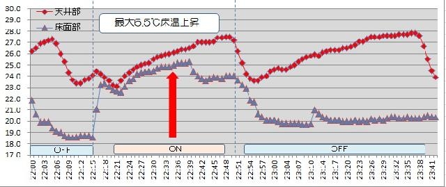 (場所:集会室 時間:約1時間)関係者様に立会い頂いて約1時間のデモ運転を行いました。26℃の暖房運転ですが足元は18〜19℃程度にしか暖まりません。窓からのコールドドラフトの影響と推察されます。エコシルフィをONにしますと数分で最大6.5℃床面温度が上昇しました。その後再びOFFにすると緩やかに温度低下します。顕著に循環気流が天井暖気を足元に還流して暖めることが確認できました。