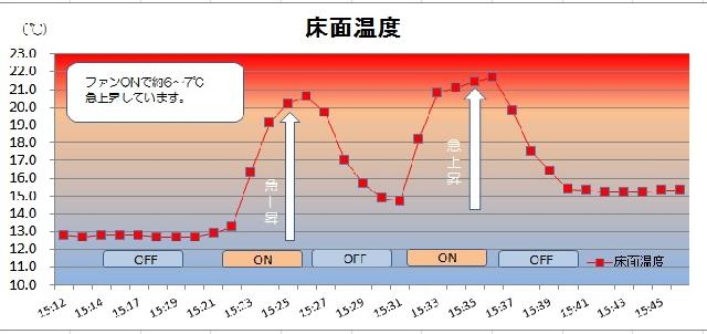 外気温10.9℃の気象条件下、暖房運転(28℃)時にエコシルフィON・OFFで床上10cm位置の温度変化を確認して効果の有無を確認しました。