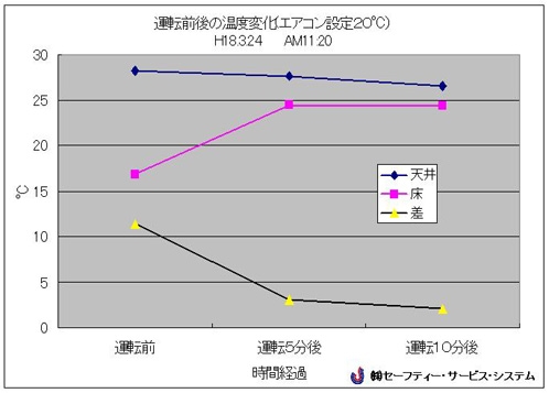 運転後10分で天井と床の温度差が11℃から3℃に縮まりました。