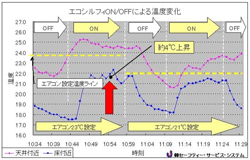 温度改善データ エコシルフィONで床付近温度が18℃付近から22℃付近まで約4℃上昇しました。エコシルフィをOFFにすると22℃付近から18℃付近まで約4℃降下していることが確認されます。天井付近の熱溜まりがエコシルフィにより吹き落されて、床付近温度が上昇し、エアコンの暖気を効果的に利用出来ていると考えられます。