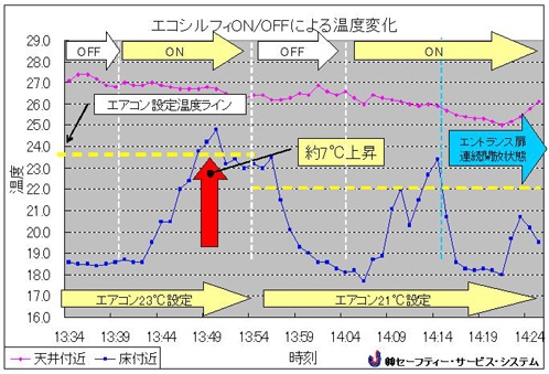 温度改善データ エコシルフィONで床付近温度が18℃付近から25℃付近まで約7℃上昇しました。エコシルフィをOFFにすると23℃付近から17℃付近まで約7℃降下していることが確認されます。天井付近の熱溜まりがエコシルフィにより吹き落されて、床付近温度が上昇し、エアコンの暖気を効果的に利用出来ていると考えられます。エコシルフィONにも関わらず14:15頃から急激に床付近温度が下降した原因は、掃除業者の方がエントランスの自動ドアを開放し続けており、冷気が大量にショウルーム内に流れ込んできたためと考えられます。