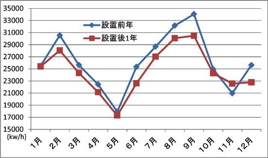 省エネデータ 店舗全体(ショールーム・営業事務室・整備工場)の使用電力量が設置前年比-5.7%削減しています。エコシルフィ設置はショールームのみで、このエリアの空調電力費は店舗全体の電力消費量の約40%と仮定した場合、約14%のショールーム空調電力費の削減効果があったことになります。