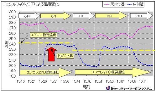 温度改善データ 23℃の暖房運転後、エコシルフィONで床付近温度が約24℃(約4℃上昇)なることが確認されました。21℃の暖房運転後、エコシルフィONで床付近温度が23℃まで上昇することが確認されました。