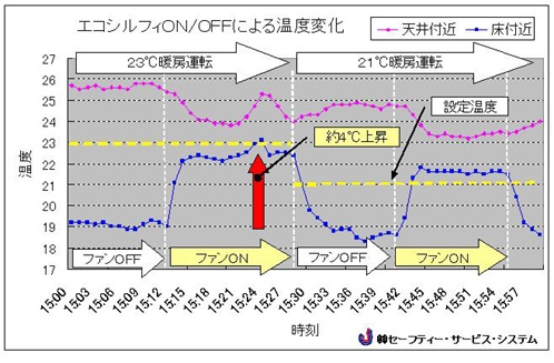 温度改善データ 28℃暖房運転を23℃に緩和して20分経過後に計測を開始しましたが、約4℃の床温上昇、ファンOFFで約5℃の温度下降が確認されました。21℃暖房に緩和運転の後、ファンONで約3℃の床温上昇が確認されました。