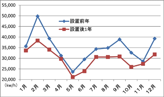 電力消費量の削減効果事例 本社オフィスがショールーム2Fに設置された店舗です。またショールームは道路側が天井高7.5mの吹き抜けで店舗奥側が3mの天井高さという変則的な構造により、冬期は非常に空調ロスの大きい店舗となり、底冷え解消のために朝早くから暖房運転をされていたようです。エコシルフィはショールームのみの設置ですが、事業所全体の電力消費量が設置前年比14.3%削減され、投資回収1.2年という結果でした。